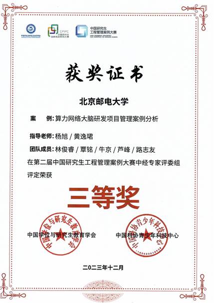 第二届中国研究生工程管理案例大赛自2023年5月份启动,全国共有133家研究生培养单位的270个案例参赛,分为“重大工程建设”、“重大系统研发”、“精益生产”、“创新创业”、“案例研究型学位论文”共五个赛道。凭借长达3个半月对案例的学术研究和出色的团队协作精神,365官网MEM代表队“邮于卷战队”提交的“算力网络大脑研发项目管理案例分析”于11月在“重大系统研发赛道”荣获三等奖。